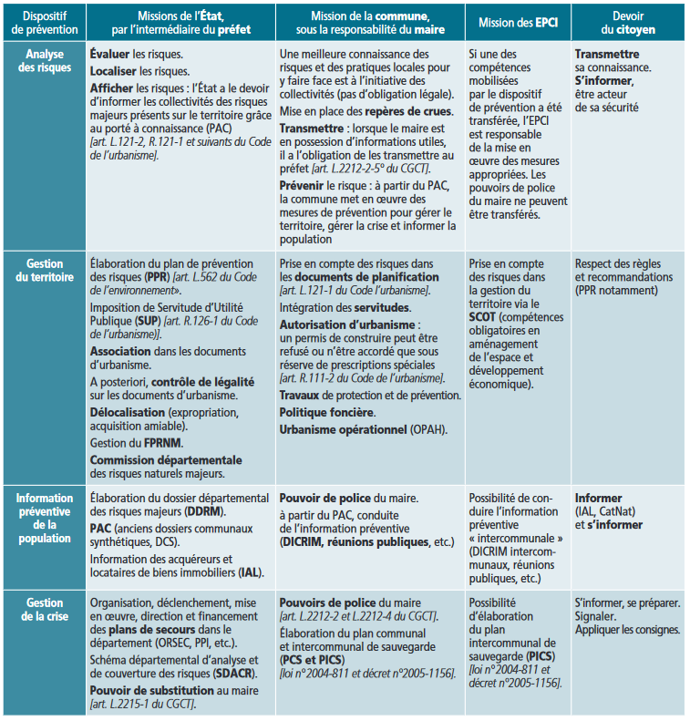 Dans le domaine de la gestion des risques naturels chacun a un rôle à jouer en matière de prévention, du citoyen à l’État en passant par les collectivités. Ces missions sont partagées selon l’emprise territoriale et le niveau de compétence des différentes autorités.