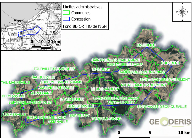 La concession minière a été accordée le 5 juin 1798 pour la recherche et l’exploitation de mines de charbon dans un secteur regroupant 33 communes de l’arrondissement de Dieppe.